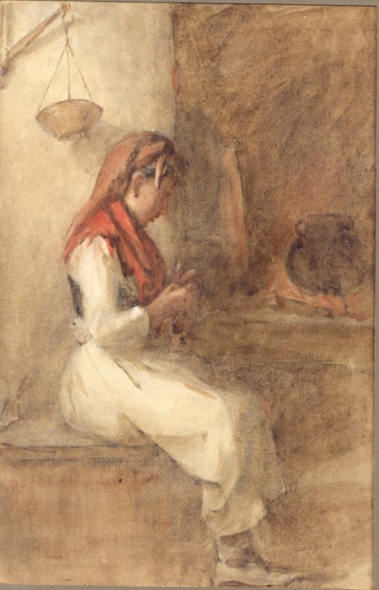 Woman doing needlework by fire.