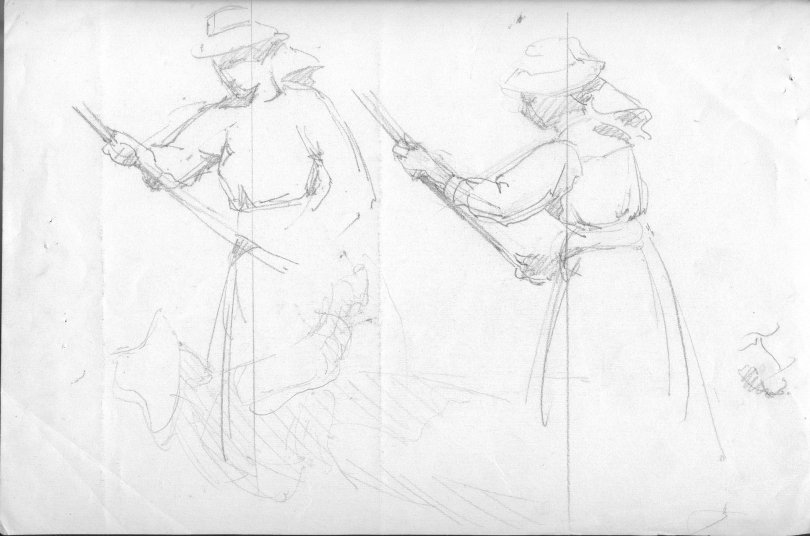 Two women hoeing or threshing.