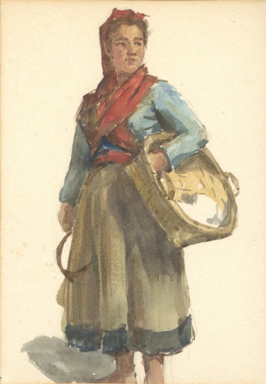 Woman carrying basket & sickle
