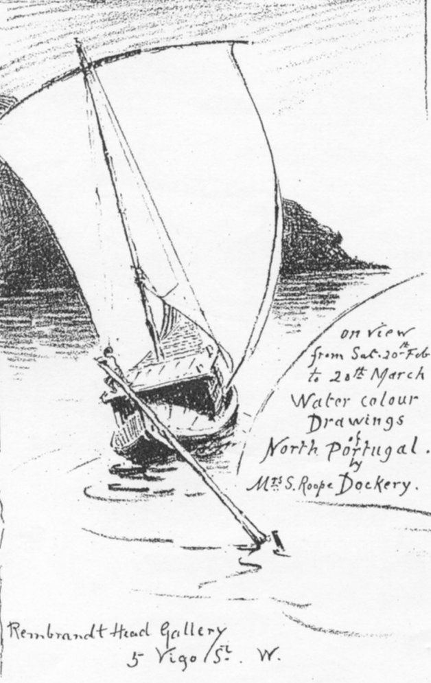 Carta de Londres (Correspondencia particular do Diario de Noticias): - Londres, 26. - Experimentei um grande prazeresta manhã visitando a galeria Rembrandt na Vigo Street, onde uma pintora aguarellista de talento, madame Roope Dockery, expõe uma serie de quadros - cincoenta e tantos numeres representando o porte de Portugal, as poeticas e luminosas reminiscencias do Porto e arredores, as soberbas margena do Douro. Os assumptos são a vindima, a pesca da sardinha, um honito grupo de reparigas tirando e peixe das redes; este quadro tem o nome de "Sardine Boats" - Espinho -, depois um bello retrado: "Uma mulhar do Porto", payzagens, marinhas, tudoisto resplendente de sol e vida.